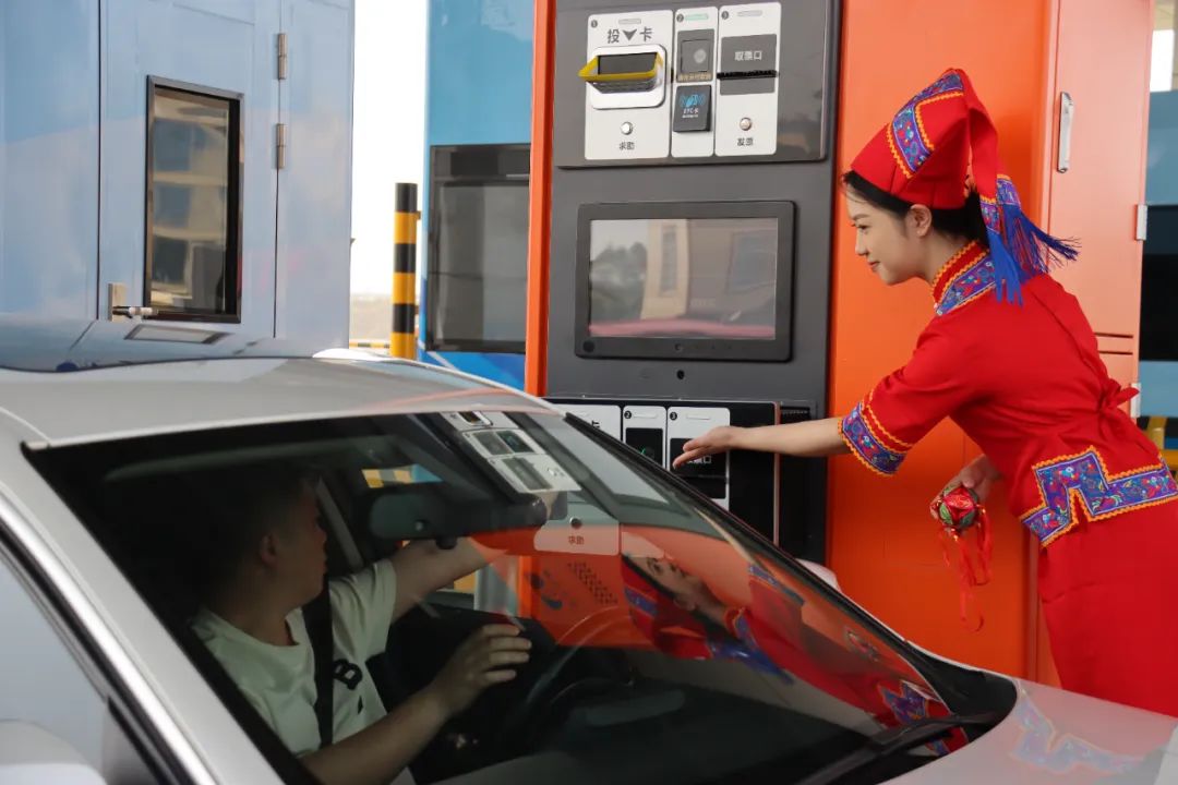 在上橫收費(fèi)總站,當(dāng)班人員身穿特色民族服裝,化身“阿哥”“阿妹”,以嶄新靚麗形象迎接廣大司乘,以傾心的微笑開(kāi)展文明服務(wù),將民族特色與收費(fèi)窗口服務(wù)相融合,成為高速路上一道靚麗風(fēng)景線。